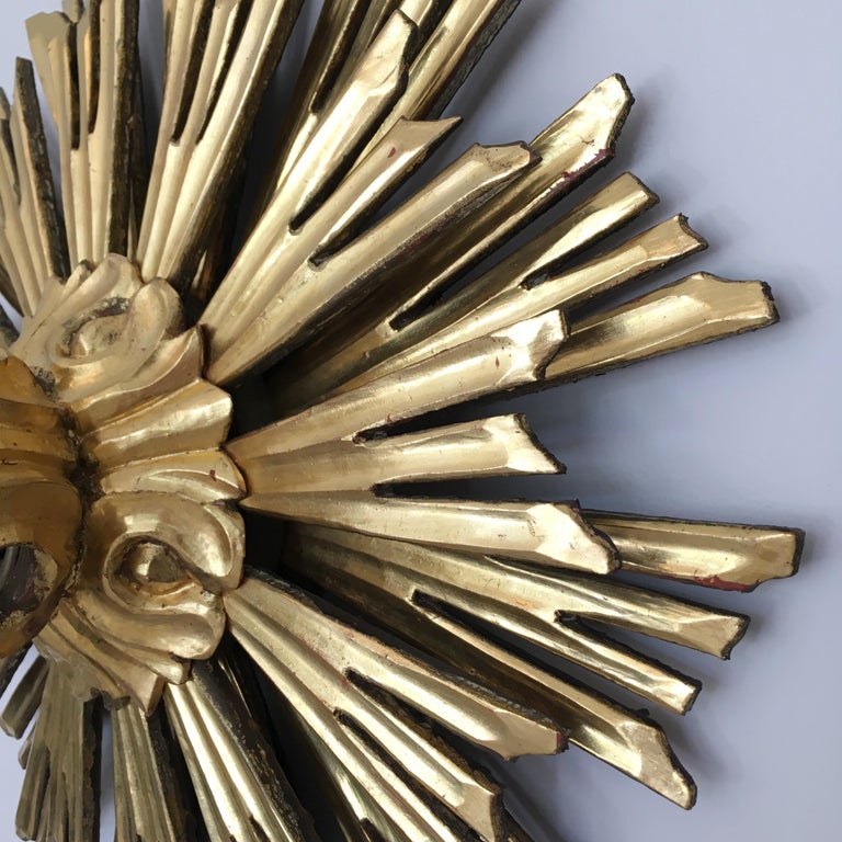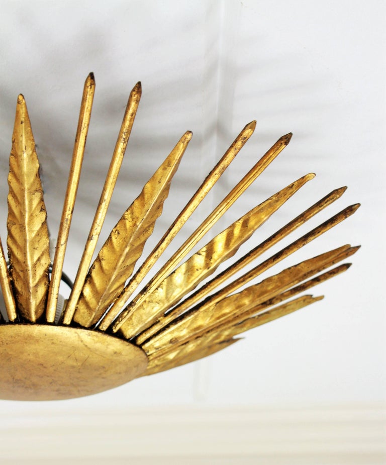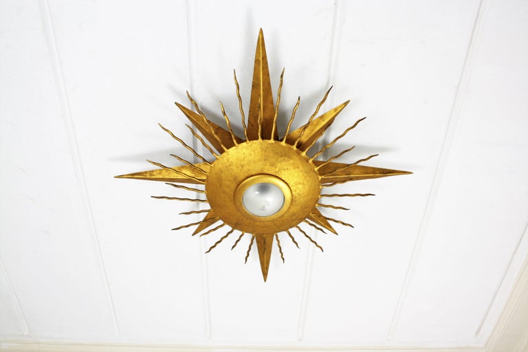 Spanish 1950s Brutalist Hammered Gilt Iron Crown Sunburst ... from a.1stdibscdn.com Using the template that comes with flush mount light fixtures, light tracing the circle of your designated location. You can change the look of a room by simply changing the lighting in the room. It is often used as a wall lamp. French sunburst starburst flush mount plafoniere ceiling, 20 inch astra sputnik semi flush mount lamp gold spike starburst light mid century, livex lighting utopia 20 in 4 light satin brass. Alexa hampton sophia flush mount, circa lighting a chic star to light up your night. Follow the manufacturer's instructions and install the dome or shade covering, connecting it to the base of the fixture. Wire nuts) to the supply wires. 3) the sunburst is very lightweight and was easily secured to the ceiling with four screws.